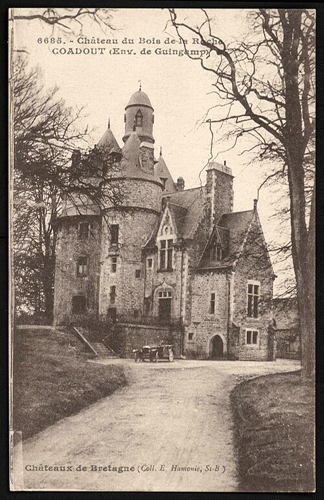 * Régis de Saint-Jouan (1990) : " Le château du Bois de la Roche, appartenant à la famille du Roscoat. Le donjon (XVè s.) est antérieur à 1489. La chapelle (XVI. s.) est en ruines. Les écuries datent du XVIIIè siècle. Le logis et la nouvelle chapelle ont été reconstruits en 1856-1860" |