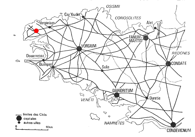 Carte Patrick Galliou, dans : "l'Armorique romaine". 1984. Point rouge rapporté par J.-C. Even. 26.11.2025, pour localiser approximativement Milizac. |