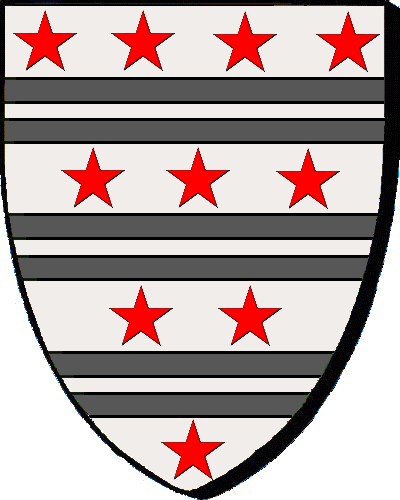 du Closmenier en Coëtmieux "d'argent à trois jumelles de sable, accompagnées de dix étoiles de gueules, 4, 3, 2, 1" (sceau 1381) "en arc'hant e deir eilenn en sabel, eilet gant dek sterdenn en gwad, 4, 3, 2, 1" (siell 1381) Perrot ratifie le traité de Guérande en 1381 [PPC] |