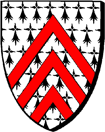 "d'azur au chevron d'or, accompagné de trois pommes de pin de même" "en glazur e gebrenn en aour, heuliet gant teir aval-pin ivez en aour" - François, président aux Grands-Jours de Bretagne en 1538, puis président à mortier au Parlement de Bretagne en 1554 - René, président à mortier au Parlement de Bretagne en 1556 - Pierre, conseiller au Parlement de Bretagne en 1565 - René, (le même ?) président à mortier au Parlement de Bretagne en 1570 Une branche fondue en 1697 dans Contades; une autre branche transplantée dans l'Orléanais, y maintenue en 1668 |