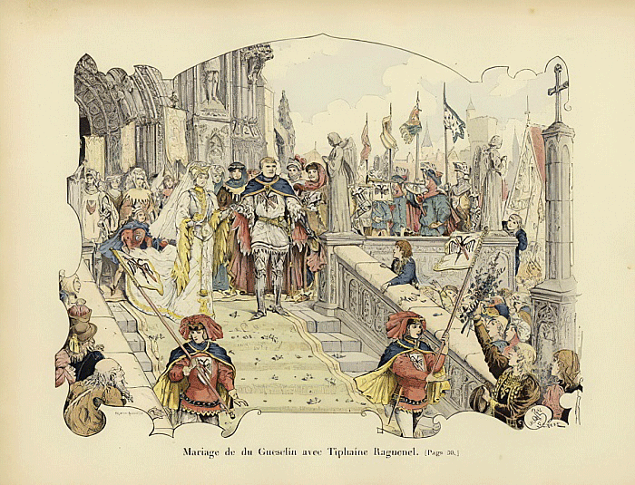 Vicomtes de la Bellière en 1451, par. de Pleudihen; sr de Chateloger et de Bonespoir, par. de Saint-Erblon, — de Montigné, par. de Vezin, — de la Touche, par. de Vallet,— de la Rivière, par. de Couëron, — baron de Malestroit, de Châteaugiron, de Derval, de Rougé et de Combourg, — sr de Faugaret, par. d’Assérac, — de Fougeray, par. de de nom, — de la Marchandrie, par. de Bouaye, — de Quélen, par. de Guégon. Réf. de 1427 £1 1513, par. de Saint-Erblon, Vezin et Bourgbarré, év. de Rennes;Vallet et Couëron, év. de Nantes et Guégon, év. de Vannes. "Écartelé d’argent et de sable, au lambel de l’un en l’autre (Sceau 1283); alias: contrécartelé de la Belliére." "Palefarzhet etre arc'hant ha sabel, e zrailhenn an eil en egile" (Siell 1283); neuz all : adpalefarzhet gant la Bellière" - Robin, conseiller et chambellan des ducs Jean II, Artur II et Jean III; décédé en 1320, - père de Robin, dit le jeune, et aïeul de Robin, l'un des chevaliers du combat des Trente en 1350, marié à Jeanne de Dinan, dame de la Belliére. De ce mariage: -- 1° Guillaume, tué à la bataille d’Auray en 1364, marié à Jeanne de Montfort; -- 2° Tiphaine, première femme de Bertrand du Guesclin; née et décédée à Dinan, 1335-1372 Image provenant de Wikipédia. Dessin de l'illustrateur Paul de Sémant (1855-1915) - Jean, tué à la bataille d’Azincourt en 1415; - Jean, maréchal de Bretagne en 1450; - Gilles, abbé du Tronchet en 1437, ‘[1473. Cette famille, substituée au XVè siècle aux nom et armes de Malestroit par alliance avec l'héritière de cette terre, a fini à Françoise, dame de Malestroit, de Châteaugiron et de Derval, mariée à Jean de Rieux, maréchal de Bretagne en 1461, et à Jeanne sa sœur, dame de la Belliére et de Combourg, mariée en 1462 à Tanguy du Chastel. ---------- Texte Pol Potier de Courcy. Traduction bretonne J.-C. Even |
