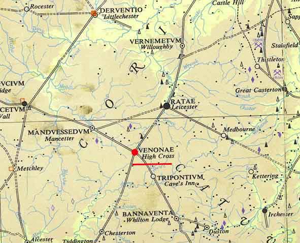 Histoire : Venonae se trouve au croisement des deux grandes routes principales romaines d'origine : la Fosse Way, d'Exeter à Lincoln, et l'Ermine Street, de Canterbury - Londres à Chester. C'est un carrefour d'une extrême importance stratégique. Son nom anglais en est d'ailleurs la meilleure illustration. |