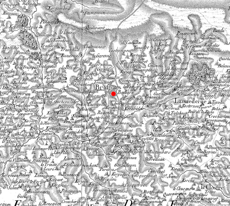 | Histoire / Istor : * Ogée (1780) : Bras-Parts; dans les montagnes d'Arès, près de la forêt de Guilliers; à 7 lieues 1/4 au N.-N.-E. de Quimper, son évêché; à 37 lieues 1/3 de Rennes, et à 3 lieues de Châteaulin, sa subdélégation et son ressort. On y compte 2600 communiants, y compris ceux de Saint-Rivoal, sa trève. La cure est à l'ordinaire. Le roi est seigneur de la paroisse, qui est fort ancienne, selon Albert de Morlaix, qui dit que saint Joava (il veut dire saint Johéven), recteur de Bras-Parts, était contemporain de saint Pol, premier évêque de Léon, et que ce prélat se démit de son évêché en sa faveur (voy. Plouvien). Ce territoire est plein de montagnes ou rochers qui se terminent presque tous en cône; ils forment un rideau dont la direction est du Faou vers Guingamp, dans une étendue du 6 lieues. Au sud de Bras-Parts et dans son territoire est la source de le petite rivière de Buis, qui fait aller le moulin à poudre qu'on voit sur la route de Quimper à Landerneau. Dans les vallons sont des terres labourables et très-fertiles en toutes sortes de grains. Les landes y sont fort étendues. On voit sur le sommet d'une des montagnes dont on a parlé une chapelle dédiée à saint Michel, d'où l'on découvre une étendue immense de pays. Dans le XIIIè siècle, le territoire de Bras-Parts renfermait les manoirs nobles de Touluaen (Toulvaën), la Marche, la Forêt, l'Esquiriou (Lesquiriou), Parchiame et Maesrangal. * Marteville et Varin (1843) : BRASPARTZ (sous
