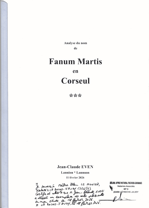 i AVERTISSEMENT ******* Les pages que vous allez lire proviennent d'une plaquette de recherche historique, de 9 (neuf) feuilles A4 imprimées seulement au recto, qui a été déposée le mercredi 18 février 2026, à 9h30, en l'étude de Me Alain Le Monier, notaire à La Roche-Jaudy (22450). Un exemplaire est conservé à l'Étude. Un autre exemplaire, signé et revêtu du timbre de l'Étude notariale, est en ma possession, avec attestation de dépôt, afin de préserver ma paternité de cette recherche historique. Quiconque en fera des extraits dans des publications, quelles qu'elles soient, sera tenu d'en citer la provenance. Jean-Claude Even |