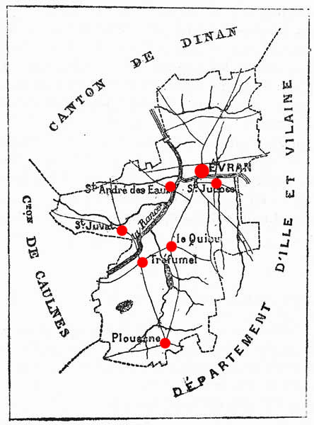 les documents cadastraux.) * Bernard Tanguy : "Si aujourd'hui la configuration en forme de champignon du territoire d'Évran paraît curieuse, elle l'était encore bien plus avant que ne lui soit enlevée en 1934, pour former la commune des Champs-Géraux, sa partie nord : elle approchait les 12 km du nord au sud mais avec un pédicule méridional n'excédant pas 2,5 km de large. A l'origine de celui-ci, il y a la création à ses dépens des paroisses de Saint-Judoce et de Saint-André-des-Eaux, relevant du diocèse de Dol. Jusqu'en 1840 et 1844, celles-ci possédèrent des enclaves dans le territoire d'Évran, qui lui-même en avait dans ces paroisses. Dans un premier temps, en 1840, Évran céda à Saint-André-des-Eaux le village de Penhouët et les prés de Bétineuc au sud de la Rance et du Guinefort, en échange de l'enclave formée par les villages de Saint-René, de La Garenne et des Rompais. Puis, en 1844, Evran céda à Saint-Judoce une enclave comprenant les villages de La Morlais et de Pont-Téniac et une partie d'enclave englobant les villages de La Cour-aux-Moines, du Champ-Siran, de Champsavoy, de La Rue, du Tertre, du Courtil-Melot et des Champs-Brunet, en échange des villages du Bout-du-Pont, de La Ricollais, du Champ-Hervé, du Champ-Berthelot, de Beauvais, de Guibourg, du Gordon-Blanc, du Haut-Breil et de La Garde ainsi que de l'enclave du Haut-Rufflay. Outre ces deux paroisses, celle d'Évran dut également englober originellement celle de Calorguen, avec laquelle elle a une limite artificielle, approchant les 6 700 ha. On peut penser, étant donné sa taille, qu'il s'agit d'une paroisse ancienne, peut-être d'origine gallo-romaine. Son chef-lieu, établi sur le Linon au passage de la voie romaine de Rennes à Corseul, porte, même s'il laisse place à une double possibilité d'interprétation, un nom gaulois". * Maires d'Évran : MMrs : VANNIER, LE FORESTIER; NOUAZE; PIEDEVACHE; FOUERE; MICHEL; HARDY du Bignon; J.M. CHAUCHART; J.P. CHAUCHART du Mottay; ROYER de Linclays; MARTEVILLE; SEVOY; ARRIBART; GANACHAS; de LANGLE; ROUER du Linclays, de LAVIE; ... liste arrêtée en 1860.en attente de la suite. |