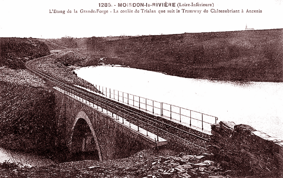 | Histoire / Istor : * Ogée (1780) : Moisdon : sur une hauteur, près la rivière de Don; à 12 lieues N.-N.-E. de Nantes, son évêché et son ressort; à 12 lieues 2/3 de Rennes, et à 2 lieues 1/3 de Chateaubriand, sa subdélégation. La cure de cette paroisse, où l'on compte 1800 communiants, est à l'Ordinaire, quoique les moines de Saint-Florent de Saumur s'en attribuent la présentation. Ce territoire fournit beaucoup de mines de fer, des terres labourable, des prairies, des landes, les forges à fer de la Forge-Neuve et de Gravotel, et la forêt Pavée, qui peut contenir mille trois cents arpents de terrain. Cette forêt et les forges appartiennent à M. le prince de Condé, seigneur de la paroisse*. L'église paroissiale est un prieuré dédié à saint Jouan, lequel est affermé 1,500 livres, an profit des moines de l'abbaye de Pirmil, près Nantes. Il a une moyenne et basse-justice, et dépend de l'abbaye de Saint-Florent de Saumur, ordre de Saint-Benoît, à laquelle il fut donné par les seigneurs de Moisdon. Il y avait encore, en 1624, deux religieux de cet ordre, qui remplissaient les fonctions curiales à Moisdon. L'an 1132, Alain, seigneur de Moisdon, donna à deux moines de l'abbaye de Pontron, de l'ordre île Cîteaux, l'emplacement du vieux bourg de Meilleraye, pour y bâtir une abbaye. (Voy. Meilleraye.) L'an 1163, Alain de Moisdon et sa femme donnèrent quelques biens qu'ils possédaient dans les paroisses de Saint-Julien de Vouvantes et de la Chapelle-Glain, à l'abbaye de Saint-Florent, lorsqu'ils présentèrent leur fils à cette maison, où il voulut prendre l'habit monastique. En 1400, la Perrière appartenait à Bernard, chevalier, seigneur de la Perrière, et, en 1680, à Pierre de la Perrière : depuis ce temps, elle a été vendue plusieurs fois, et appartient maintenant à un particulier de Chateaubriand; la Herbretière, à Guillaume de la Herbretière; la Courtelinaye, à Robin du Pavillon; la maison du châtelain de Meilleraye, la métairie noble de.... au prieur du Châtelier; le manoir de Lerissaye, à Guillaume du Houssai; la Haye-Cherel, à dom Pierre Picon; la Galmelière, à Jamet Rouxel; la Rivière-Payen, aujourd'hui la Rivière-Péan, à Jean de la Rivière : ces deux dernières forment une haute, moyenne et basse-justice, et appartiennent à Mlle du Bois-Adam; la chaussée de Moisdon, à Jacques Rouxel : c'est aujourd'hui un hameau ou village composé de sept à huit maisons; la Botelière, à Jamel de la Rotelière; la basse-justice du Pavillon appartient à M. Duhamel.