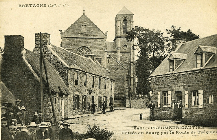 * Jean-Claude Even : A l'époque de l'indépendance gauloise, puis durant l'empire romain, ce territoire fait partie de la cité des Ossismes, dont la capitale est Vorgium / Carhaix, située au centre géographique de la cité. De façon plus précis, le territoire de Pleumeur-Gautier se trouve en Pagus Tricurius > Bro Dreger / Trégor. Il fait partie de la dotation faite par l'empereur Maxime (Magnus Clemens Maximus Augustus) / Maxen Wledig, à son beau-frère, le Britto-romain Conan (Mériadec), vers 385. Il fait donc ainsi partie du premier 'royaume' breton de Bretagne armoricaine. ******* * Ogée (1779) : Plemeur-Gaultier; à 1 lieue 1/4 à1'E.-N.-E. de Tréguier, son évêché; à 29 lieues de Rennes, et à 2 lieues de Pontrieux, sa subdélégation. Cette paroisse ressortit à Lannion, et compte 3000 communiants, y compris ceux de Lézardrieux, sa trève. La cure est à l'alternative. Son territoire est un pays plat, dont les terres produisent d'abondantes récoltes en grains et lin; on y voit des landes assez étendues. La maison noble de Lezartrevu appartenait, en 1230, à Jean Alain, sieur de Lezartrevu, dont le fils, nommé Alain, fut évêque de Tréguier en 1262. Le château du Botloy, place jadis forte, fut démoli en 1592; il n'en reste plus que quelques vestiges, et un colombier en partie écroulé. Cette terre, qui a haute, moyenne et basse-justice, a long- temps appartenu à la famille de Richelieu. L'an 1773, M. le Prêtre de Châteaugiron l'acheta de M. le maréchal duc de Richelieu : ce château était situé près la rivière de Trieuc. Le château de Poulglau appartenait, en 1340, à Robert de Kergariou, chevalier, seigneur de Kerépol. Les autres maisons sont : le Goueslou, Kermarquer-les-Hardrien, Kermengui, le Merdi, Kermeuri, Pont-Glo, et Trovoas. * Marteville & Varin (1843) : PLEUMEUR-GAUTIER