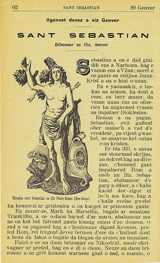 Setu ar pez a 'n em gavas gant sant Sebastian. Heman a oa eun den en karg, eur mignon bras d'an impalaer; bali an enor a oa digor dirakan, alc'houe ar binvidigez a oa etre e zaouarn. Mes Dioklesian a ra brezel da Jezuz-Krist; ha Sébastian, ma eo stag ouz e garg, a gar Doue, dreist pep tra.
