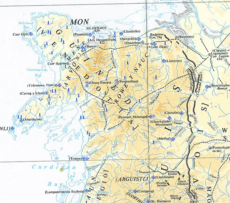 Carte extraite de William Rees : An Historical Atlas of Wales. Early Dynasties in Wales : The Cunedda Conquest (5th Century A.D) Les territoires portant les noms des fils de Cunedda sont représentés en hachuré. On peut y reconnaître : Osmaeliaun(< Osmael); Einion Yrth (< Einion); Rhufoniog (< Ruvon); Dogfeiling (< Dogmael); Dunoding (< Dunawd); Afloegion (< Afloeg); Meirioneydd (< Meirion); Ceredigion (< Caradog). |