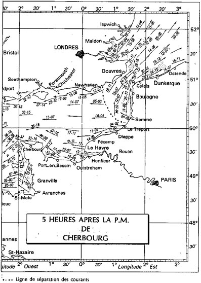 Ces lignes, toujours courbes, convexes à l'ouest et concaves à l'est, se déplacent, selon les heures de marées, de Newhaven au Havre, ligne ouest, et Sunk / Colchester (GB) à Shouwen (NL), ligne est (heures de Dieppe PM--5H40). (4)