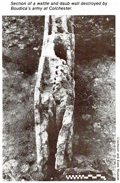 Dans la High Street (Rue Haute), en 1927, sur le site du restaurant Jacklin du côté nord, il y avait " un remarquable dépôt de poterie cassée, verre et autres produits, presque exempt de terre, et ainsi sans protection ces fragments s'en allèrent en pluie cliquetante dès qu'on les toucha". Ce dépôt contenait des bocaux de poterie samienne ou de type similaire, et d'autres vaisselles, d'abord brisées puis brûlées au noir. Dans certains cas, le verre avait fondu." 11. Tacite. Annales. 14/XXXIII " Le municipe de Verulam éprouva le même désastre ...". 12. Tacite. Annales. 14/XXXVII. 13. Suétone. Néron. XXXIX; XL. Selon Dion Cassius, LXII.8.2, Boudicca aurait engagé pour le combat final 230 000 hommes. 14. Tacite. Annales. XXXVII : " ... la fuite était difficile, parce que la barrière continue des chariots fermait les issues ". 15 et 16. ibid. 17 et 18. Tacite. Annales. XXXIII et XXXVII. 19. Suétone. Agricola. XVI. |