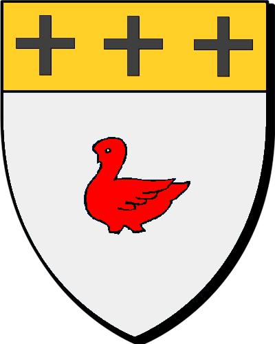 "d'argent à trois têtes de chapon (= coq) arrachées de gueules" / "en arc'hant e zri fenn kilhog (pe kabon) diframmet en gwad (= en gul). Armorial 1696 - Des syndics, procureurs et notaires à Lesneven. - Un capitaine au régiment de Berry, fusillé à Quiberon en 1795 Ce nom est employé dans les réformations et montres de 1426 à 1503, paroisse de Landouzan, évêché deLéon. |