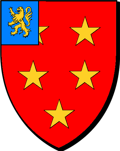 J.-C. Even. JUZEL, seigneurs du Cosquer, par. de Nostang; du Camper et du Parc, par. de Kervignac; de Bothurel, par. de Sérent; de Saint-Cujan, par de Cléguer. Réf et montres de 1426 à 1336, par. de Nostang, Gléguer, Kervignac et Sérent, év. de Vannes. "De gueules à cinq étoiles d'or; 2. 2. 1; au canton d'azur, chargé d'un lion d'or" "En gwad e femp steredenn en aour, 2, 2, 1; e c'hrenngonk en glazur, karget gant ul leon en aour" alias / neuz all: "un croissant surmonté d'un lambel" / "ur greskenn leinet gant un drailhenn" (Sceau / Siell 1418). - Jean, auditeur à la Chambre des Comptes de Bretagne en 1425 ; - Guillaume, trésorier général du duc en 1487. Une autre source donne : "d'azur, au croissant d'argent, surmonté d'un lambel de gueules / en glazur, e greskenn en arc'hant, leinet gant un drailhenn en gwad" |