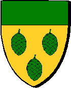 Famille de Tanguy : "d'or, à trois pommes de pin de sinople; au chef de même / en aour, e deir aval-pin geotet; e c'hab ivez geotet" |